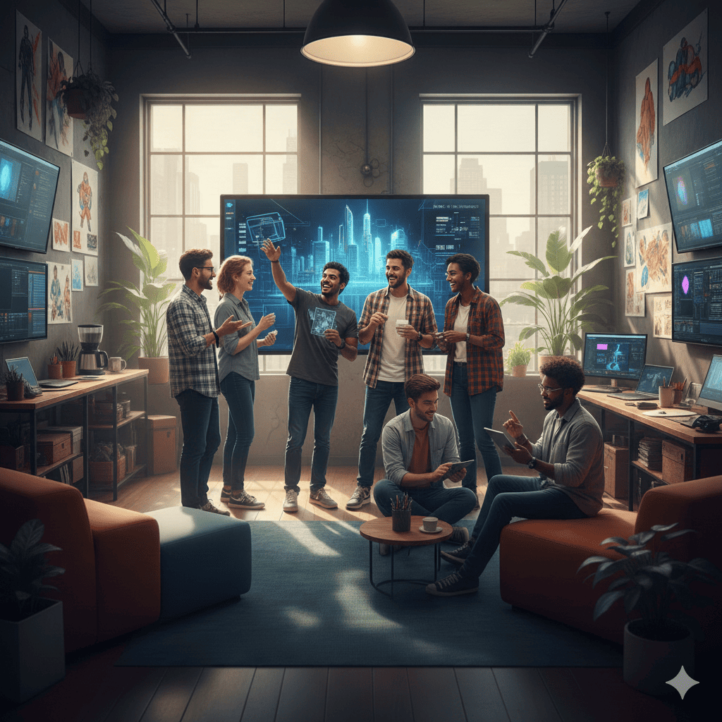 We are a team of passionate individuals working towards a common goal. We prioritize collaboration over competition, believing that the best ideas come from working together. Every department—whether creative, technical, or operational—works closely to ensure our projects are executed seamlessly and with the highest quality.